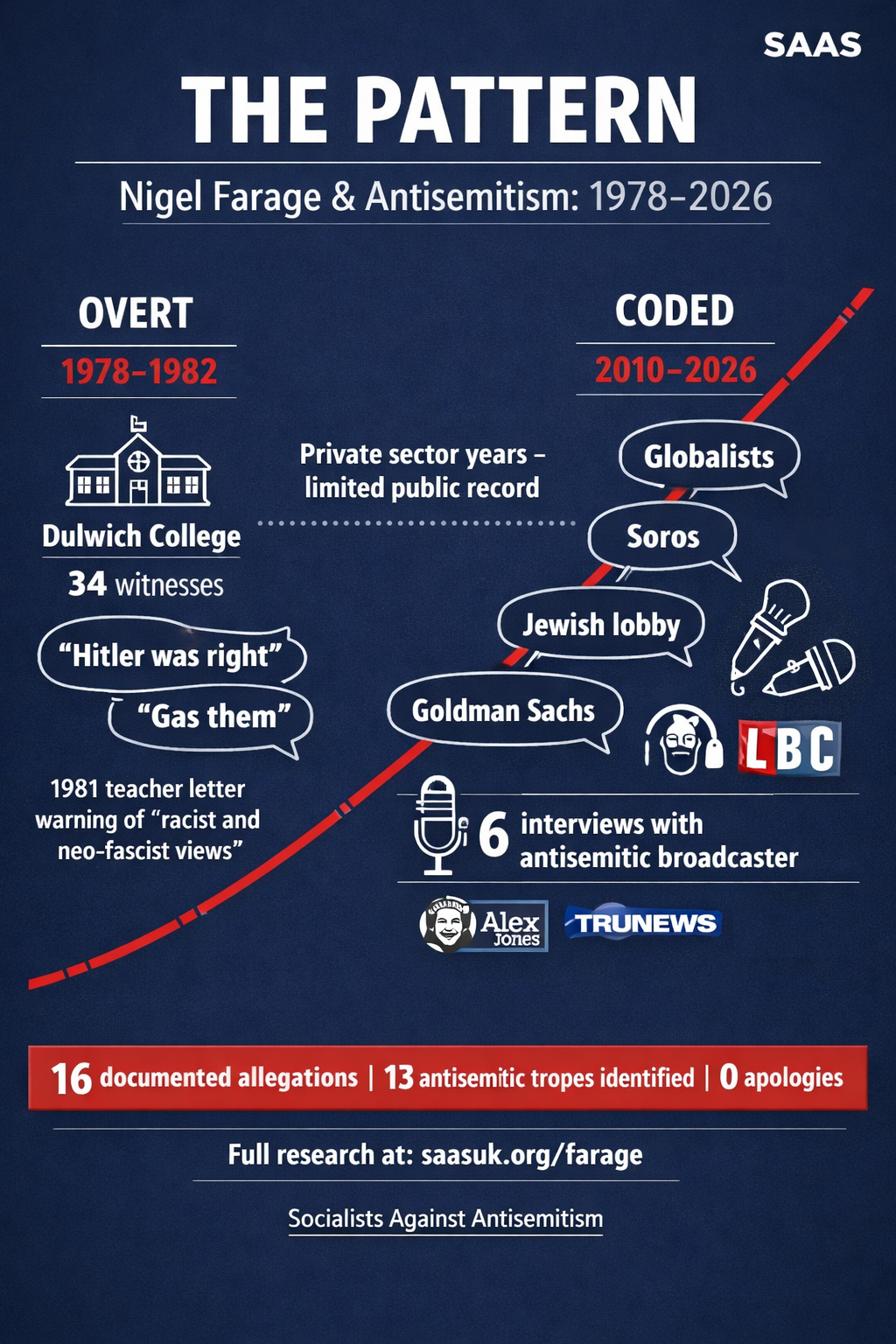 Dan Jacobs traces a consistent thread in Nigel Farage's alleged antisemitism: school-era claims of racist and antisemitic bullying, backed by a contemporaneous 1981 letter, followed by an adult career shifting from slurs to coded tropes. “Jewish lobby”, Soros conspiracism, “globalist” rhetoric, and platforming extremist outlets build a cumulative pattern.