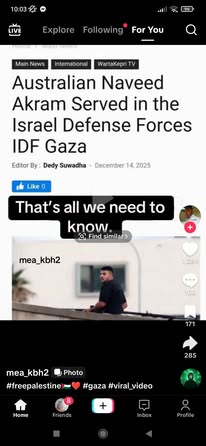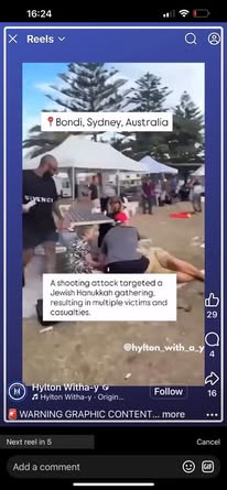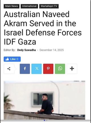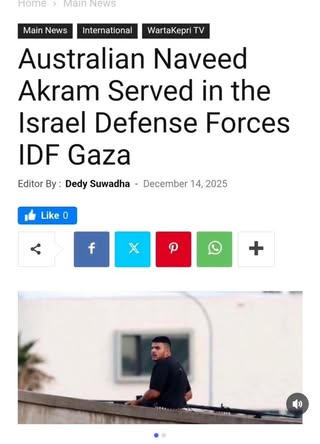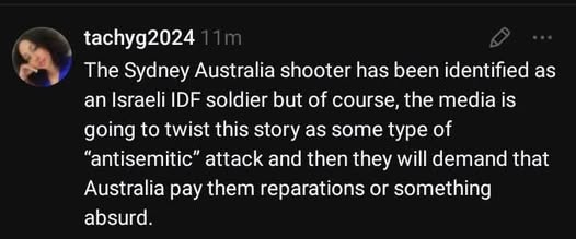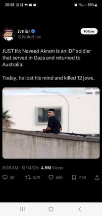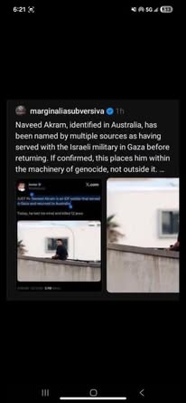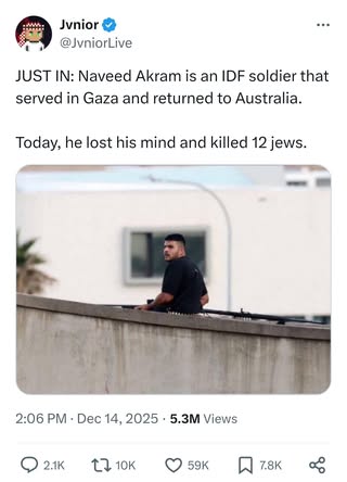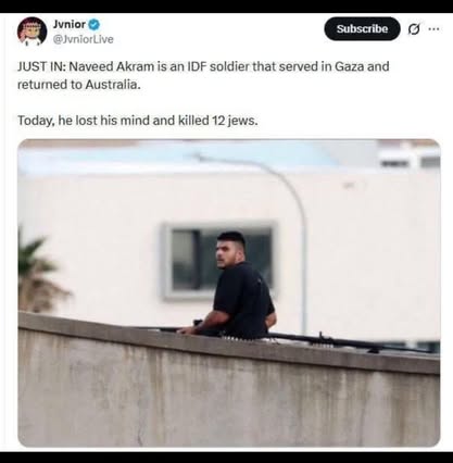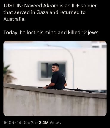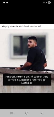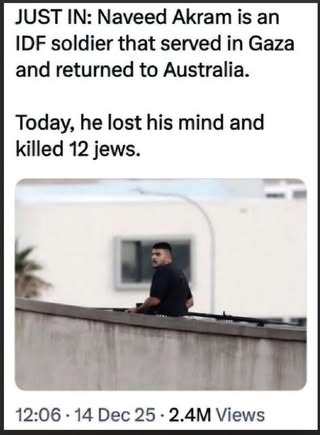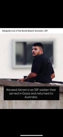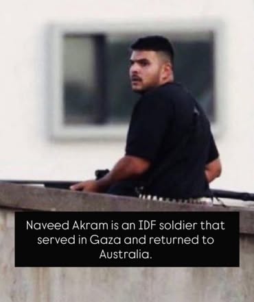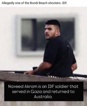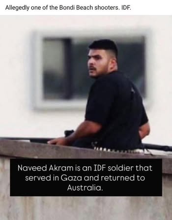 | IMG | Antisemitic | ![]() [Image/Meme] The image shows a man on a rooftop, armed, with text below identifying him as an IDF soldier named Naveed Akram who served in Gaza and returned to Australia. | |