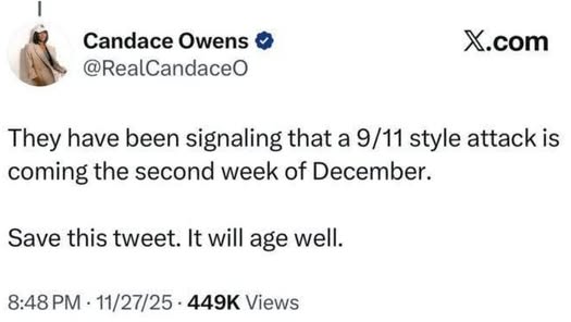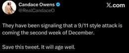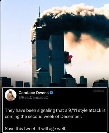 | IMG | Antisemitic | ![]() [Image/Meme] A tweet from Candace Owens discussing a predicted attack akin to 9/11, suggesting imminent danger, with a timestamp and view count displayed. | |