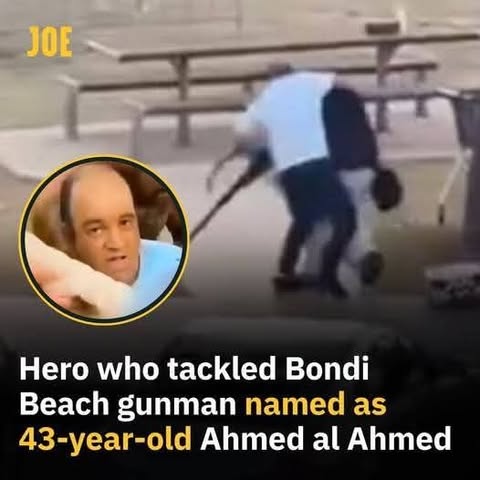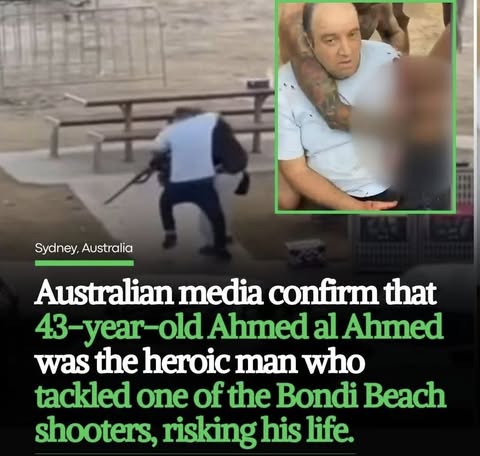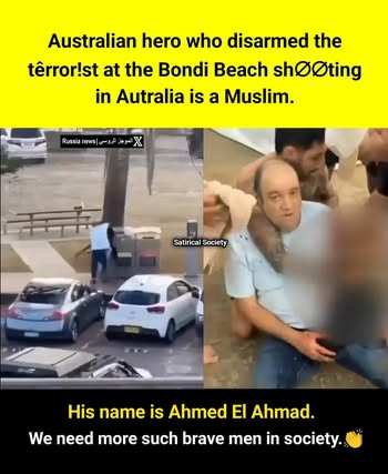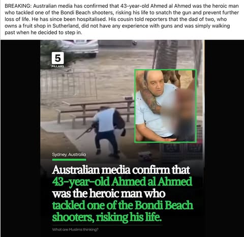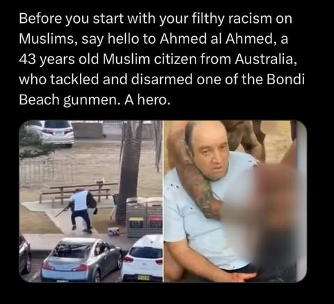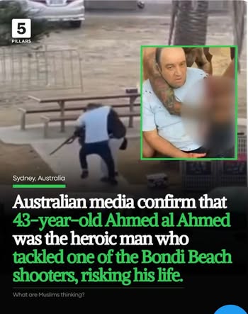| IMG | Praising Muslim Hero | ![]() [Image/Meme] The image shows a man tackling a shooter, with text below providing information about Ahmed Al-Ahmed, who disarmed one of the Bondi Beach shooters, noting his bravery and detailing that he is 43 years old. The scene appears to be set in Sydney, Australia, with the context focusing on a heroic act in a violent situation. | |