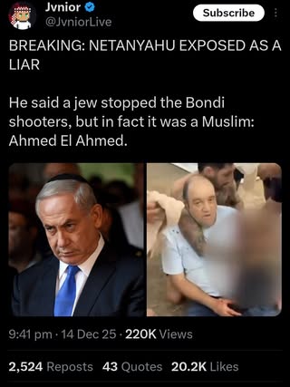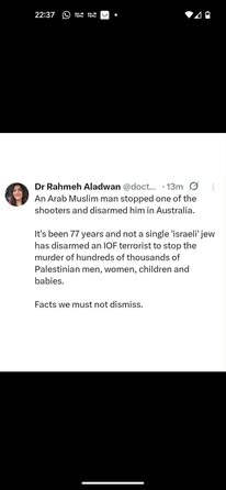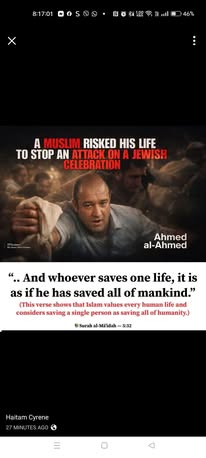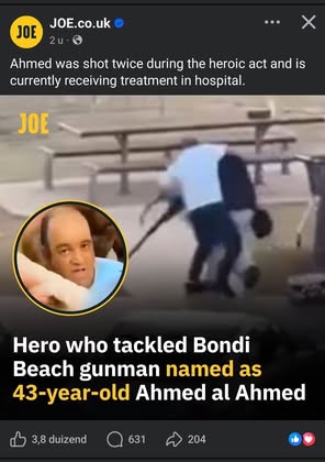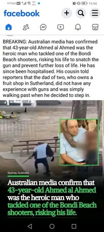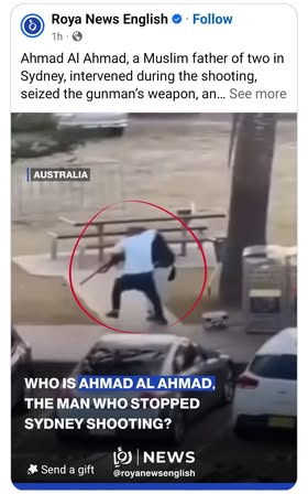 | A.K. | Praising Muslim Hero | Thanks Ahmed for saving hundreds of lives at Bondi beach including Jewish and other people regardless of race and religion 👏 A!PAC funded media identifies you as father of two 🤭 https://scontent-man2-1.xx.fbcdn.net/v/t39.30808-6/599806694_122188050644503381_7418389586180478359_n.jpg?stp=cp6_dst-jpg_p261x260_tt6&_nc_cat=107&ccb=1-7&_nc_sid=bd9a62&_nc_ohc=eTEDI7C0-EYQ7kNvwFnvI6l&_nc_oc=AdkpxCHSNtZJlAJKdoz9-3vz0IC5gbNYdM7VPc0IL8p5MdeTLd87SFhuaJvrPOJuYaY&_nc_zt=23&_nc_ht=scontent-man2-1.xx&_nc_gid=6_JTrRbmdrl6MaghiuAwRg&oh=00_AfnI_BV5dVEMQVdwUBtbgeSgAqthq3nJZYV7DIzy-9cIaQ&oe=69461983 | |