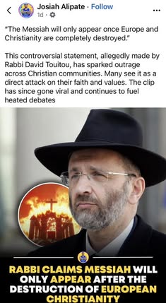 | IMG | Antisemitic | ![]() [Image/Meme] The image shows a man wearing a hat, presumably a rabbi, along with a quote and contextual information regarding a controversial statement allegedly made by him about the Messiah and European Christianity. | |