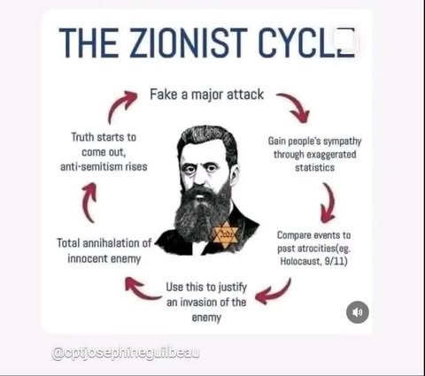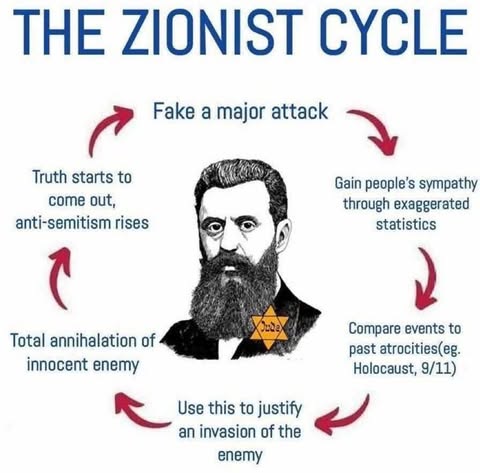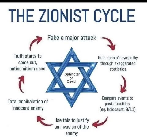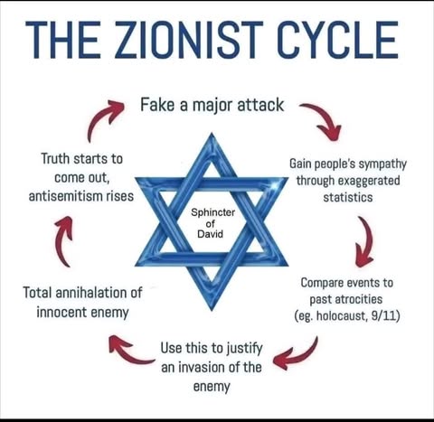 | IMG | Antisemitic | ![]() [Image/Meme] The image shows a circular diagram labeled "THE ZIONIST CYCLE" featuring a Star of David in the center. The diagram outlines several steps, including 'Fake a major attack', 'Gain people's sympathy through exaggerated statistics', 'Compare events to past atrocities (e.g., holocaust, 9/11)', 'Use this to justify an invasion of the enemy', 'Total annihilation of innocent enemy', and 'Truth starts to come out, antisemitism rises'. | |