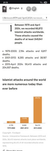 | IMG | Political Commentary | ![]() [Image/Meme] The image shows a text excerpt from a report stating statistics about Islamist attacks worldwide between 1979 and April 2024. It includes three specific time frames with the number of attacks and deaths associated with each period, along with a graph indicating the increasing trend in the number of attacks over the years. | |