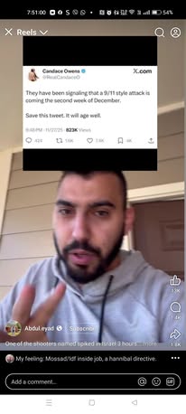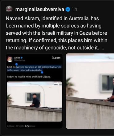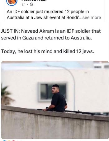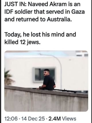 | IMG | Antisemitic | ![]() [Image/Meme] The image depicts a social media post that claims an individual named Naveed Akram, identified as an IDF soldier, killed 12 Jews at a Jewish event in Bondi, Australia. It includes a photo of a man standing outdoors, possibly on a ledge or balcony, looking away from the camera. The post appears to link the individual’s identity to the attack while suggesting a narrative involving Israel and the Jewish community. | |