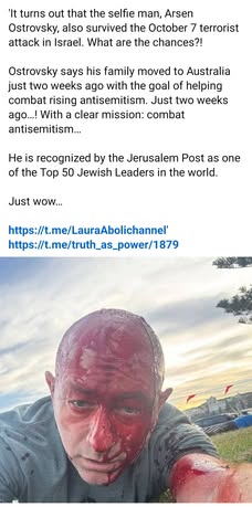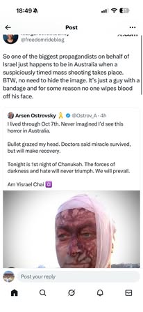 | IMG | Antisemitic | ![]() [Image/Meme] The image shows a man with a distressed expression and paint or blood on his face, suggesting he has been involved in a traumatic event. The background appears to be a beach, possibly Bondi Beach, and there are text elements discussing Arsen Ostrovsky, his mission against antisemitism, and his recent survival of a terrorist attack. | |