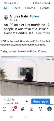 | IMG | Antisemitic | ![]() [Image/Meme] The image shows a post from Andrea Nabi on social media, discussing an incident where an IDF soldier allegedly killed 12 people at a Jewish event in Bondi Beach. It includes a claim about the soldier's background and emphasizes the number of Jewish victims with a derogatory tone. | |