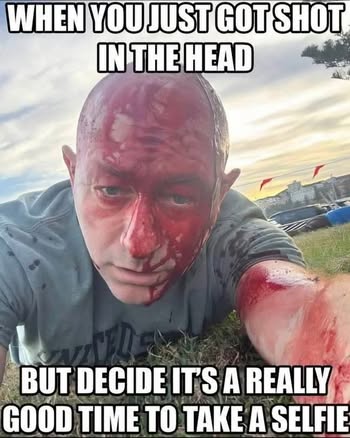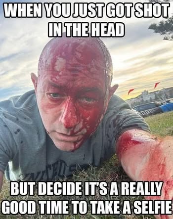 | IMG | Antisemitic | ![]() [Image/Meme] A man lying on the ground with a bloody head, appearing to have been shot. He is taking a selfie, with a facial expression that suggests he is unfazed or making light of the situation. | |