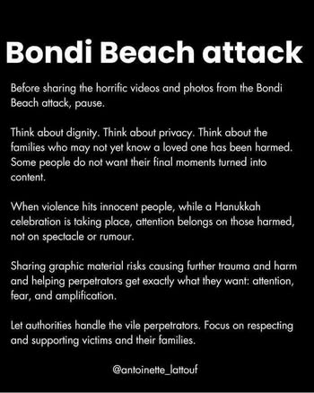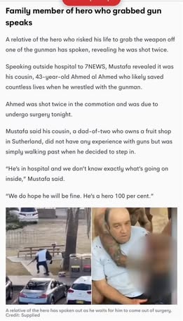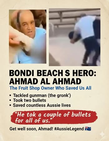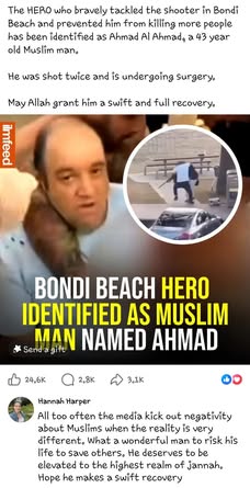 | IMG | Praising Muslim Hero | ![]() [Image/Meme] The image is a social media post highlighting a heroic act by Ahmed al Ahmed, a man who intervened during the Bondi Beach attack. It includes text about his bravery and a statement from a family member, along with hashtags related to community strength and courage. | |