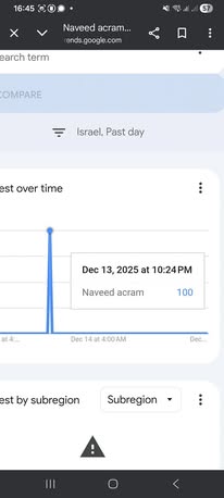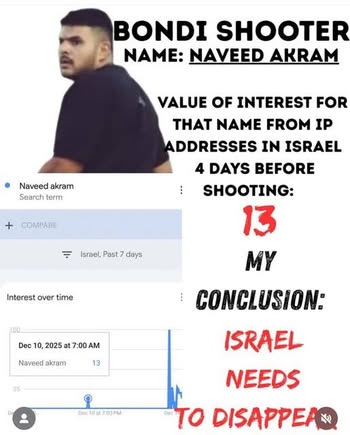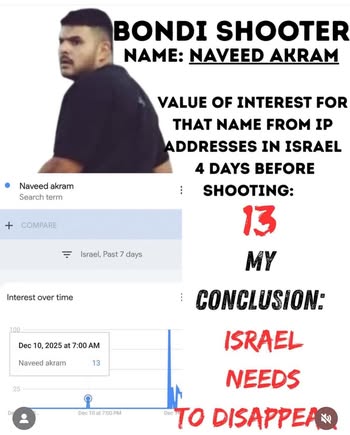 | IMG | Antisemitic | ![]() [Image/Meme] The image shows a man identified as the Bondi shooter named Naveed Akram. Below, there is a Google Trends graph indicating interest in the name 'Naveed Akram' in Israel over time, specifically mentioning a spike of interest with the value 13 dated December 10, 2025. The text asserts a conclusion that 'Israel needs to disappear.' | |