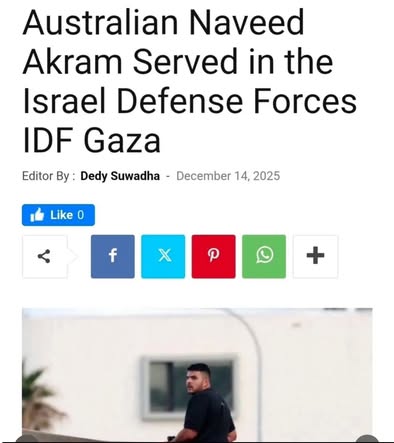| IMG | Antisemitic | ![]() [Image/Meme] The image shows a headline from a news article claiming that an individual named Naveed Akram, identified as Australian, served in the Israel Defense Forces (IDF) in Gaza. The layout includes a photograph of a person, along with social media sharing buttons. | |