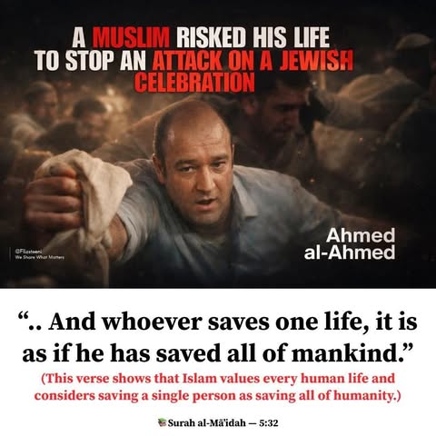| IMG | Praising Muslim Hero | ![]() [Image/Meme] The image shows a tribute to Ahmed Al Ahmad, a fruit shop owner who intervened during an attack at Bondi Beach. It includes a photo of him tackling the attacker, along with an accompanying text that highlights his bravery and the lives he saved. | |