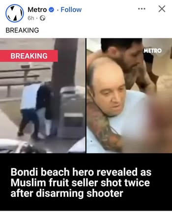 | IMG | Praising Muslim Hero | ![]() [Image/Meme] An image featuring a scene from the Bondi Beach shooting, depicting a Muslim man identified as a hero who disarmed the attacker. The layout includes footage of the incident with onlookers and the heroic figure receiving attention. | |
