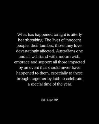 | A.B. | Praising Muslim Hero | Man who took one of the gunmen down was Muslim. The guy who did similar in England was Muslim too. I lived in a Muslim country people were great.A lot of comments online trying to connect this to Palestinians which makes zero sense. Israel and Judaism are two very different things conflating the two is not helpful to Jewish people and would add to antisemitism. And is insulting to Jewish people who have no ties to Israel. This was done by a group of dillusional people. Their religion or colour shouldn't even come into it. This is what causes hatred and division. Its a few bad people . | |