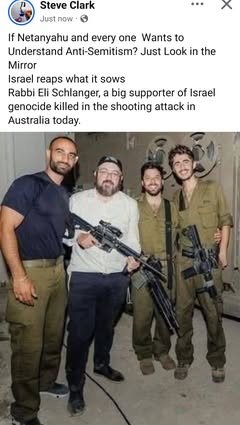 | IMG | Antisemitic | ![]() [Image/Meme] The image shows a man standing with a firearm, purportedly linked to the Bondi Beach shooting. There is a text overlay claiming he is an IDF soldier who served in Gaza and returned to Australia. | |