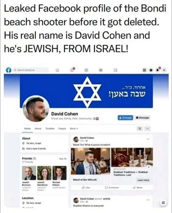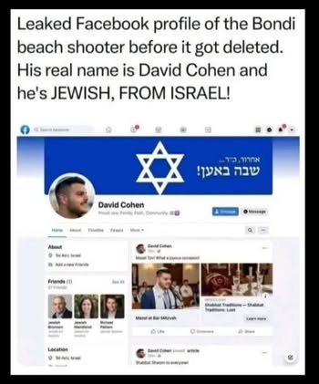 | IMG | Antisemitic | ![]() [Image/Meme] The image shows a Twitter post purportedly revealing the Facebook profile of the Bondi Beach shooter, claiming the shooter's real name is David Cohen and emphasizing his Jewish identity with a Star of David in the profile header. | |