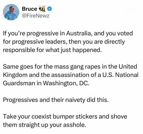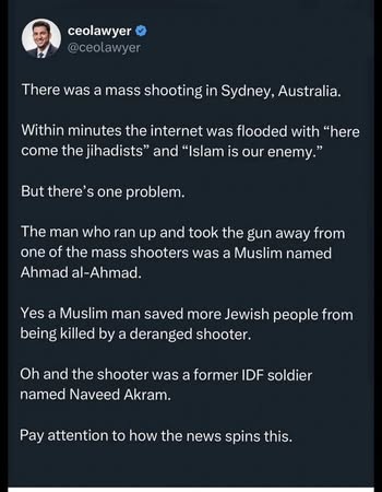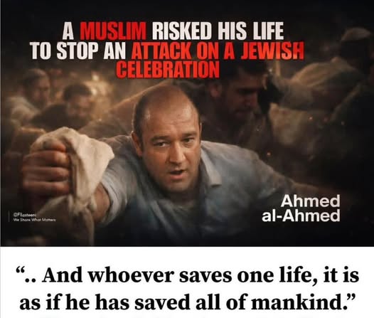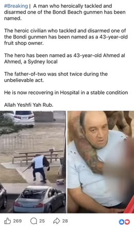 | S.F. | Praising Muslim Hero | "I just woke up to the news from Australia. It’s just unacceptable! I pray for the speedy recovery of those innocents who were injured in the attack. Humanity must be thankful to Ahmad al-Ahmad, the man who saved the lives of many today." Mosab Abu Yoha https://scontent-man2-1.xx.fbcdn.net/v/t39.30808-6/597664127_3190078154497062_5089423909362011416_n.jpg?stp=dst-jpg_p417x417_tt6&_nc_cat=100&ccb=1-7&_nc_sid=bd9a62&_nc_ohc=Kmb2PeffarkQ7kNvwHewp-H&_nc_oc=AdkI4a6MtamGZEaYy_IjFSgdXCeAxowQo3HRIzJG2u-Yb6NdE03XKpN6QJ7Mc2pFdKs&_nc_zt=23&_nc_ht=scontent-man2-1.xx&_nc_gid=gnf6r8zfZw8OxavEmg7A5w&oh=00_Afl4cJz5tDcIsvJ-lXs77_Of-WjZMuYmBkm04o3nEUI4ZQ&oe=6945ED8B | |