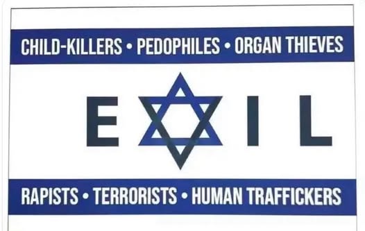| IMG | Antisemitic | ![]() [Image/Meme] The image displays a graphic featuring a Star of David with the word 'EVIL' spelled out in the center, surrounded by labels such as 'CHILD-KILLERS', 'PEDOPHILES', 'ORGAN THIEVES', 'RAPISTS', 'TERRORISTS', and 'HUMAN TRAFFICKERS'. | |
