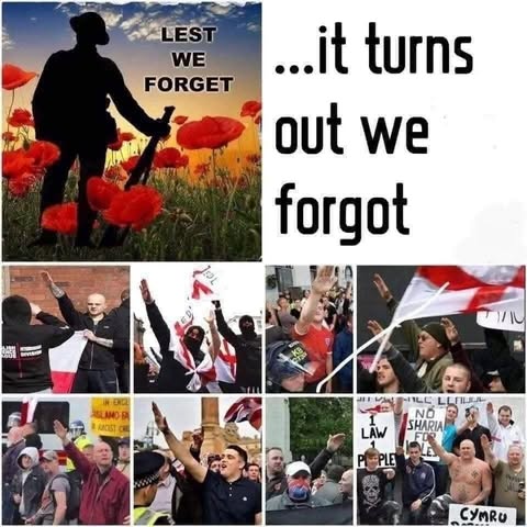 | IMG | Antisemitic | ![]() [Image/Meme] The image shows a tribute to fallen soldiers with the text 'LEST WE FORGET' alongside a series of images depicting various crowds performing what looks like a Nazi salute, with flags and banners that suggest far-right or extremist ideologies. | |