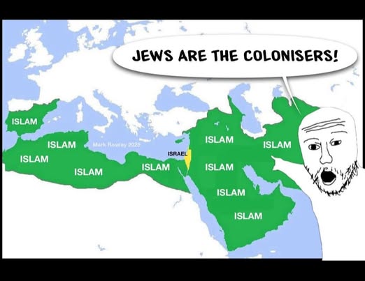 | IMG | Antisemitic | ![]() [Image/Meme] The image shows a map of the Middle East with regions labeled 'ISLAM' and one region labeled 'ISRAEL'. A cartoonish character with an exaggerated expression is depicted speaking, with a speech bubble stating 'JEWS ARE THE COLONISERS!'. | |