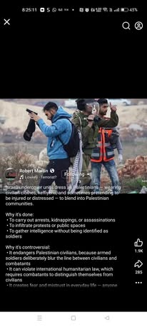 | IMG | Antisemitic | ![]() [Image/Meme] The image shows a group of individuals, likely engaged in a protest or conflict situation, with one person in a blue jacket holding a phone or camera. They appear to be in a rugged outdoor environment, possibly a conflict zone related to Palestine. | |