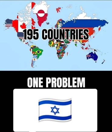 | IMG | Antisemitic | ![]() [Image/Meme] The image shows a world map made up of various country flags with the text '195 COUNTRIES' above it. Below the map, there is a set of text that says 'ONE PROBLEM' with the Israeli flag depicted beneath it. | |