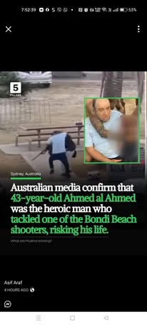 | IMG | Praising Muslim Hero | ![]() [Image/Meme] The image shows a news report about Ahmed Al-Ahmed, a 43-year-old man who intervened during the Bondi Beach shooting to tackle one of the shooters and prevent further loss of life. The background shows a still image of the scene, focusing on Ahmed. | |