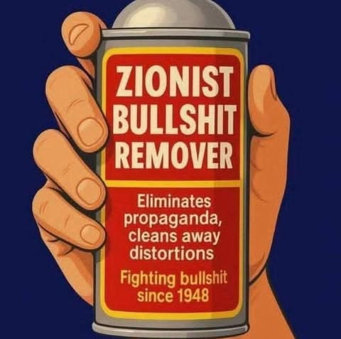 | IMG | Antisemitic | ![]() [Image/Meme] The image features a spray can labeled 'ZIONIST BULLSHIT REMOVER' held in a hand. The can includes a tagline that reads 'Eliminates propaganda, cleans away distortions' and claims to be 'Fighting bullshit since 1948.' | |