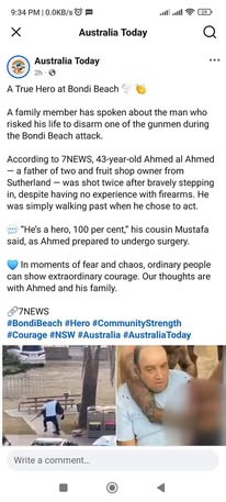 | IMG | Praising Muslim Hero | ![]() [Image/Meme] The image shows a post about a heroic act where a man named Ahmed al Ahmed tackled and disarmed one of the Bondi Beach attackers. It includes a photo of the man, presumably the hero, and mentions details about him and his current condition in the hospital. | |