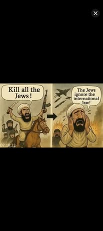 | IMG | Antisemitic | ![]() [Image/Meme] The image shows a cartoon split into two panels. The left panel features a bearded man on horseback, holding a gun, with a group of armed men, all depicted aggressively. The speech bubble from the man reads, 'Kill all the Jews!' The right panel shows a man with a similar appearance, holding his head in despair, with the text, 'The Jews ignore the international law!' Background imagery suggests a scene of destruction or chaos. | |