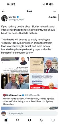 | IMG | Antisemitic | ![]() [Image/Meme] A post discussing claims about Zionist networks and staged shooting incidents, featuring a picture of Arsen Ostrovsky and another unspecified image. | |