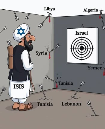 | IMG | Antisemitic | ![]() [Image/Meme] The image depicts a caricature of a man wearing Islamic attire with an ISIS label, standing in a room adorned with arrows pointing at a target labeled 'Israel'. There are labels for various countries like Libya, Algeria, Syria, Yemen, Tunisia, and Lebanon around the walls, with arrows protruding from them, suggesting hostility or violence directed at Israel. | |