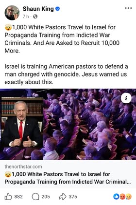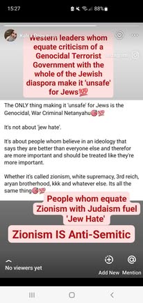 | IMG | Antisemitic | ![]() [Image/Meme] The image shows a text post criticizing Western leaders for equating criticism of the Israeli government with antisemitism. It portrays these leaders as responsible for making it unsafe for Jews and mentions figures like Netanyahu. The text delves into the relationship between Zionism and Judaism, suggesting that equating the two fuels 'Jew Hate.' | |