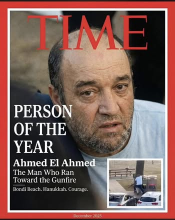 | IMG | Praising Muslim Hero | ![]() [Image/Meme] The image depicts a mock cover of Time magazine featuring a man with the text 'PERSON OF THE YEAR' and the name 'Ahmed El Ahmed'. Below the name, it reads 'The Man Who Ran Toward the Gunfire' with a subtitle of 'Bondi Beach. Hanukkah. Courage.' An image of a scene depicting a violent event is included in the corner. | |