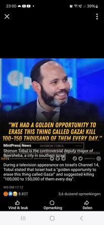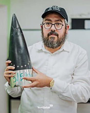 | IMG | Antisemitic | ![]() [Image/Meme] A man wearing a white shirt and a black cap is holding what appears to be a missile or bomb casing, with a green marking on it. There is a plant in the foreground and a whiteboard in the background, indicating an indoor setting. | |