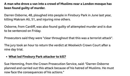 | G.S. | Political Commentary | Can people please stop saying it was a Muslim that stopped 1 of the gunmen cos I’m sure the gunmen wife and mother who is Muslim probably knew what they were up to and she did nothing to stop it. Salman Abedi brother and the Didsbury Mosque iman did nothing to stop him. This Ahmed guy is a real exception and yes he saved many lives but prevention is much better than a reaction so let’s all condemn the people who did nothing to stop this attack! | |