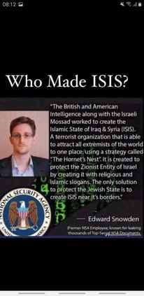 | IMG | Antisemitic | ![]() [Image/Meme] The image features a quote attributed to Edward Snowden, stating that the British, American, and Israeli Mossad intelligence agencies collaborated to create ISIS. It includes a photo of Snowden, the logo of the NSA, and claims about a conspiracy involving Israel and ISIS. | |