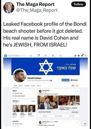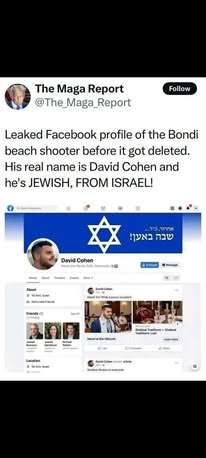 | IMG | Antisemitic | ![]() [Image/Meme] The image shows a Twitter post from an account named 'The Maga Report'. It presents a supposed leaked Facebook profile of the Bondi Beach shooter, claiming his name is David Cohen and stating he is Jewish and from Israel. The profile includes a photo of a young man and a Star of David. | |