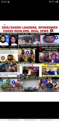 | IMG | Antisemitic | ![]() [Image/Meme] The image contains a collage with various faces and names labeled with stars of David, equating individuals to being Jewish and implying they are connected to ISIS/Daesh. The top text claims these are 'fakes Muslims, real Jews'. | |