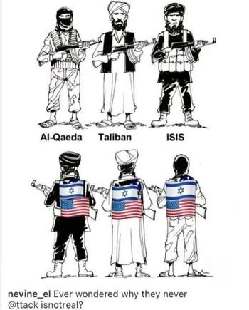 | IMG | Antisemitic | ![]() [Image/Meme] The image consists of cartoon figures depicting various militant groups, labeled Al-Qaeda, Taliban, and ISIS, with three additional figures wearing attire that combines elements of military and civilian clothing but has insignia related to the U.S. and Israeli flags. The text below reads, 'Ever wondered why they never #attack isnotreal?'. | |