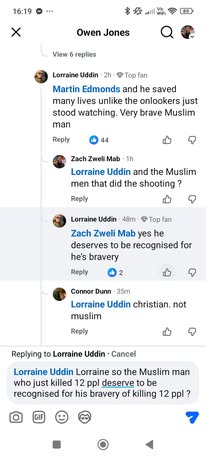 | IMG | Praising Muslim Hero | ![]() [Image/Meme] A series of comments in response to Owen Jones discussing a recent attack. The comments mention a Muslim man saving lives and engage in a conversation about bravery and identity. | |