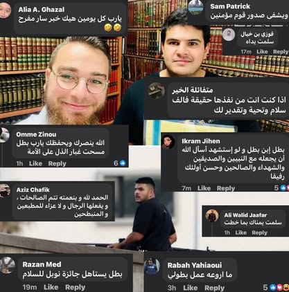 | IMG | Praising Muslim Hero | ![]() [Image/Meme] The image appears to be a compilation of comments from various social media users, likely responding to a specific event or incident. The comments include expressions of gratitude, admiration, and praise for a person who intervened in a violent situation, along with supportive messages in Arabic. There are also smiling faces and gestural communication in the photos, indicating a celebratory or appreciative tone. | |