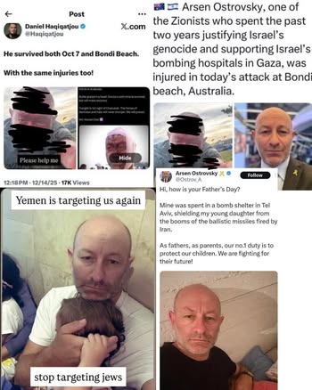 | IMG | Antisemitic | ![]() [Image/Meme] The image is a collage containing several posts and images. It features a personal post by Daniel Hagigaqou discussing injuries sustained during a recent attack at Bondi Beach. There's also a photo of a man, likely Arsen Ostrovsky, displaying visible injuries. Some text mentions Yemen targeting Jews and talks about justifying Israel's actions. The posts appear to paint a picture of personal victimhood while linking it to political narratives. | |
