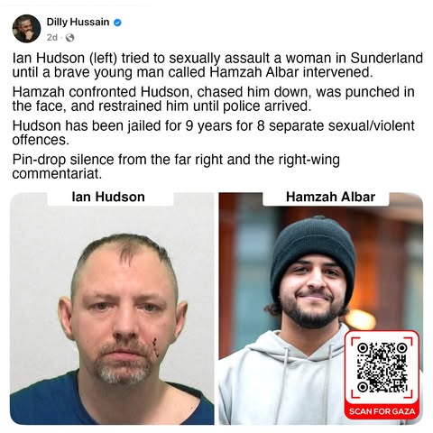 | IMG | Praising Muslim Hero | ![]() [Image/Meme] The image features two photographs side by side. On the left is a man identified as Ian Hudson, who has a facial injury and a somber expression. On the right is a man named Hamzah Albar, who is smiling and appears to be of Middle Eastern descent. There is text accompanying the images that discusses an incident where Hamzah Albar intervened during a sexual assault attempt by Ian Hudson. | |