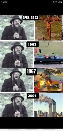 | IMG | Antisemitic | ![]() [Image/Meme] The image consists of a series of four panels depicting a man in traditional Jewish attire reacting with a laugh or smug expression to historical events: the crucifixion of Jesus in AD 33, the assassination of JFK in 1963, the Six-Day War in 1967, and the September 11 attacks in 2001. Each panel is labeled with the corresponding year and event, suggesting a mocking portrayal of these significant occurrences in history. | |