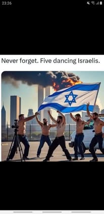 | IMG | Antisemitic | ![]() [Image/Meme] The image depicts five men, shirtless, holding an Israeli flag and celebrating in front of a burning building, which is likely meant to represent the 9/11 attacks. The scene conveys a sense of jubilation juxtaposed with tragedy in the background, indicating a provocative interpretation of historical events. | |