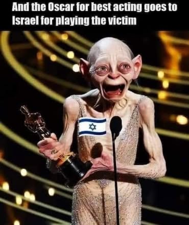 | IMG | Antisemitic | ![]() [Image/Meme] The image shows a grotesque figure resembling Gollum from 'The Lord of the Rings' holding an Oscar trophy, wearing an outfit with the Israeli flag. The background suggests a stage or award ceremony atmosphere. | |
