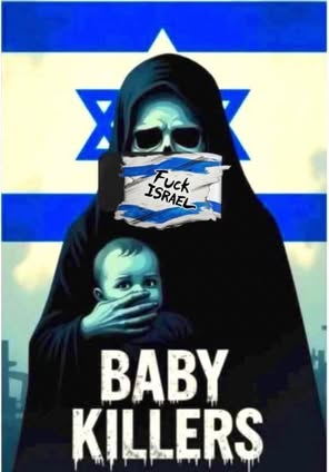 | IMG | Antisemitic | ![]() [Image/Meme] The image depicts a figure dressed in black with a hood and skeletal features, holding a child. The backdrop features the Israeli flag. Over the figure's mouth is a banner that says 'Fuck Israel,' and the text at the bottom reads 'BABY KILLERS.' | |